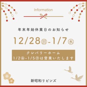 年末年始休業のお知らせ 平素より新昭和リビンズをご愛顧いただき、誠にありがとうございます。誠に勝手ながら、下記期間を年末年始休業とさせていただきます。【休業期間】2025年12月28日(日)~2026年1… 続きを読む